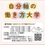 2025年9月1日 / 最終更新日 : 2025年12月9日 smilemama 未分類 自分軸の働き方大学【準備編】コココリン 【自分軸の働き方大学】募集開始! 子育てと両立しながら私らしい働き方を見つけよう! 好きなこと、得意なことを仕事にするための講座です。 9月スタートは【準備編】です✨ 基本は3回セットですが、単発でも参加で […]